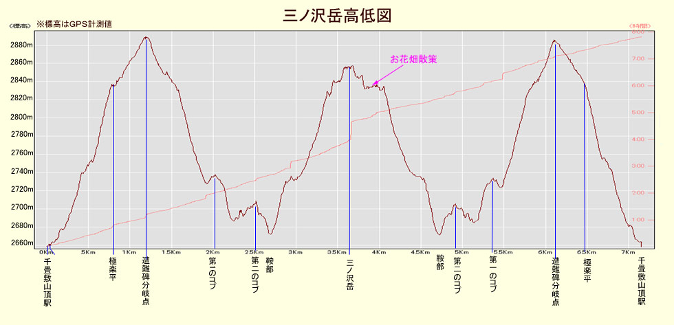 RW山頂駅標高/2650M 遭難碑分岐点標高/2887M 三ノ沢岳標高/2846.5m 標高差/237M 総歩行距離/7159M | ||||