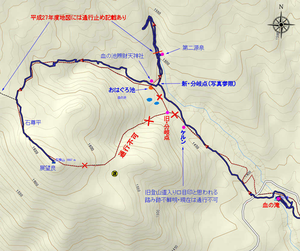 新分岐点で記載されているが「おはぐろ池」の表記場所間違いにより、高原地図と同じルート表記と勘違いをしました(;´Д`) |