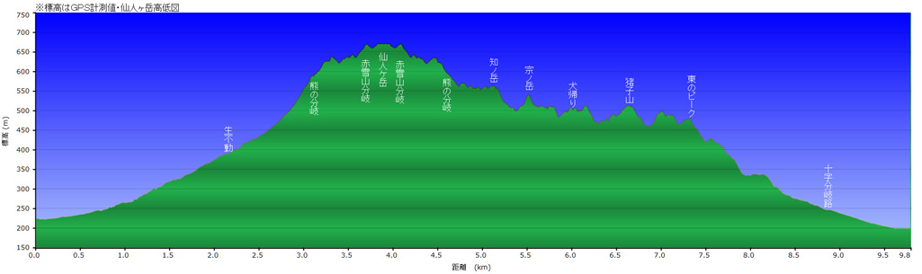 ↑画像クリックで拡大表示 小俣北町駐車場標高/206m 標高差/456.9m 累積標高/868m 総歩行距離/9795m |