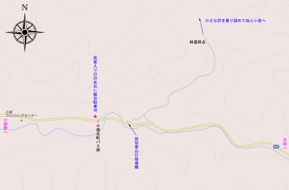 小俣北町駐車場 約9台(下山時撮影) | 県道218を東上して登山口へ向かう | |||