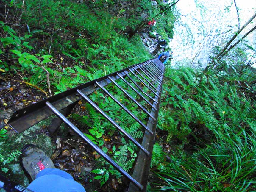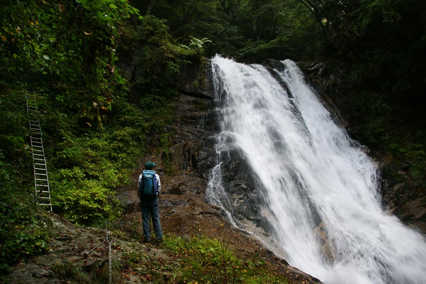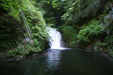 片鞍滝の横に架けられた超ロングな鉄梯子 | ||||