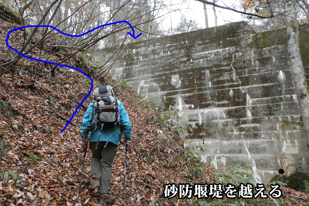 堰堤を越えて藪道に入るが踏み跡を外さないよう進む |