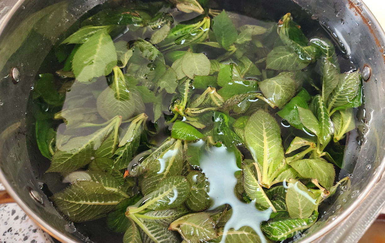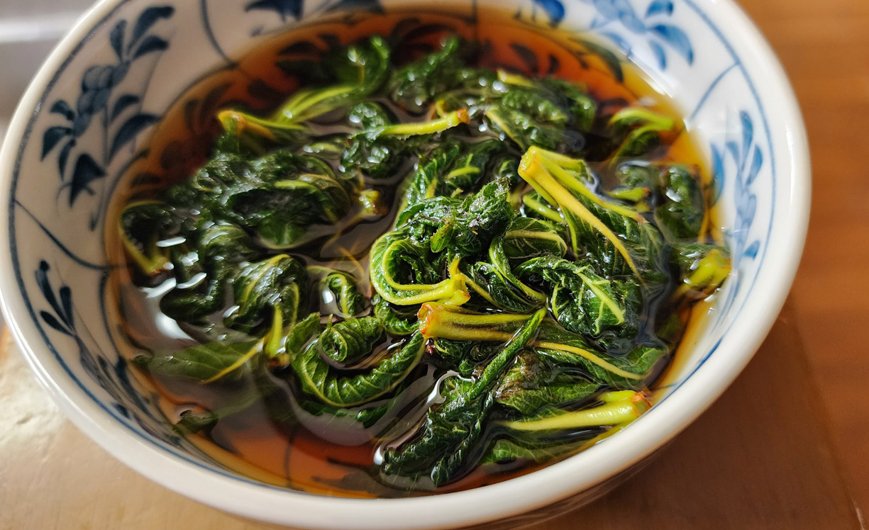茹でたリョウブをだし汁に浸す・又はだし汁でほわ〜と煮る |