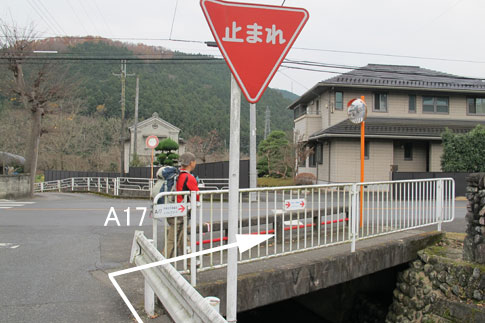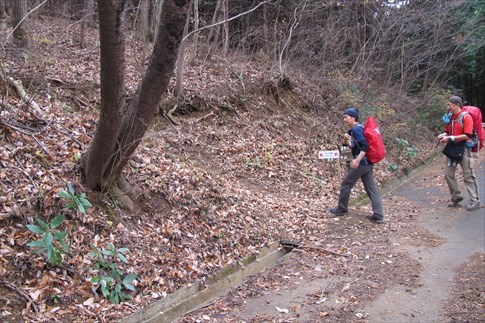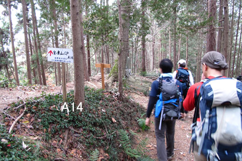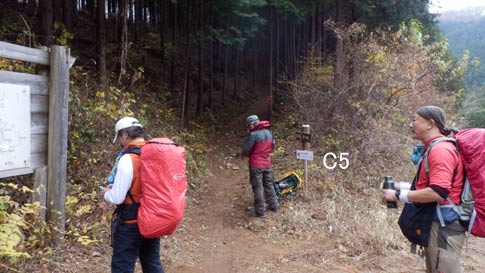 二十二夜供養塔を通過後緩く下って林道出合地点がC6指導標 |
