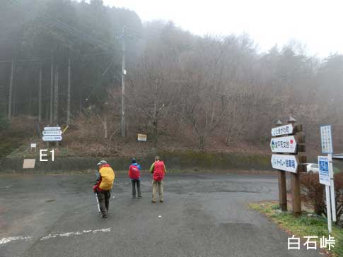 剣ヶ峰の尾根筋を下ること10分ほどでE1指導標の白石峠(東屋あり)に到着 |