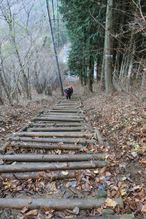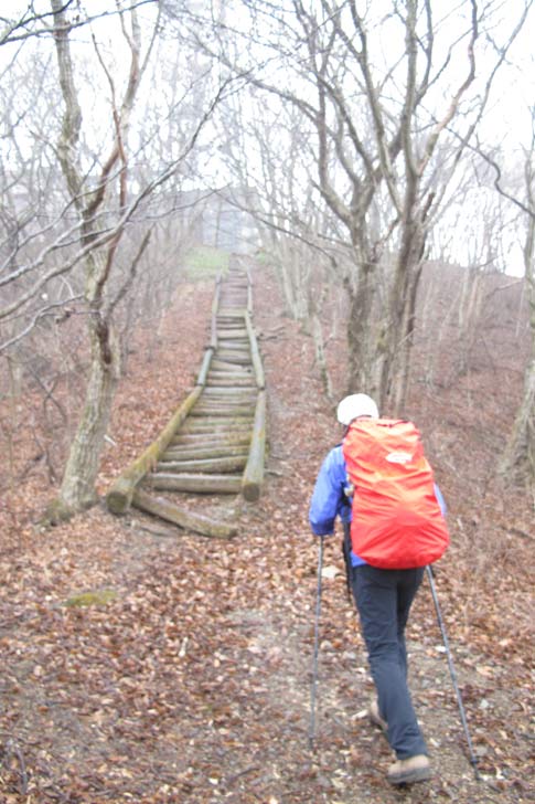 E1指導標からは深くえぐれて歩きにくい試練の木階段登りが待っていました (ノД`) |