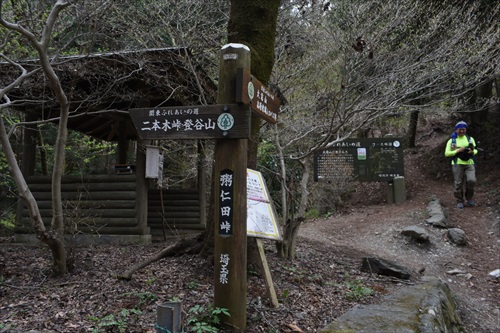 二本木峠からの車道歩き後、ここJ2標で登山道に入る |