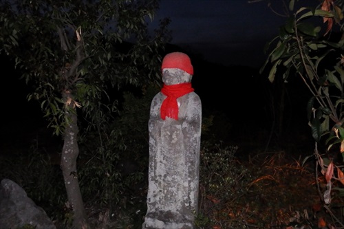 地蔵尊と釜伏山参道石柱 pm18:45 主要道に出たがまだまだ先は長い! |
