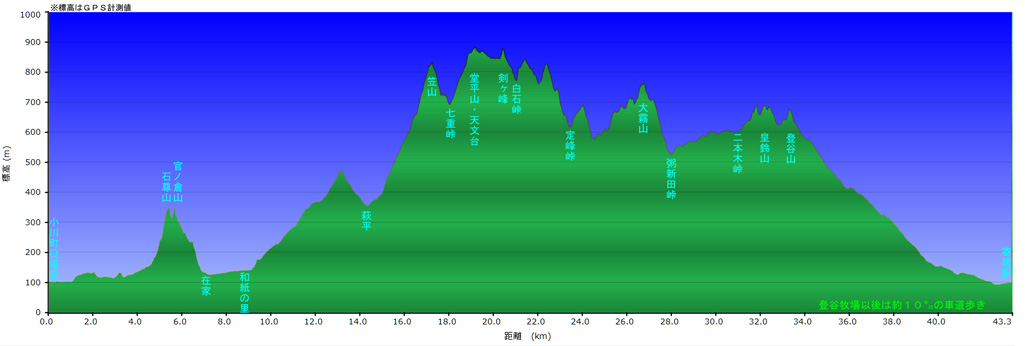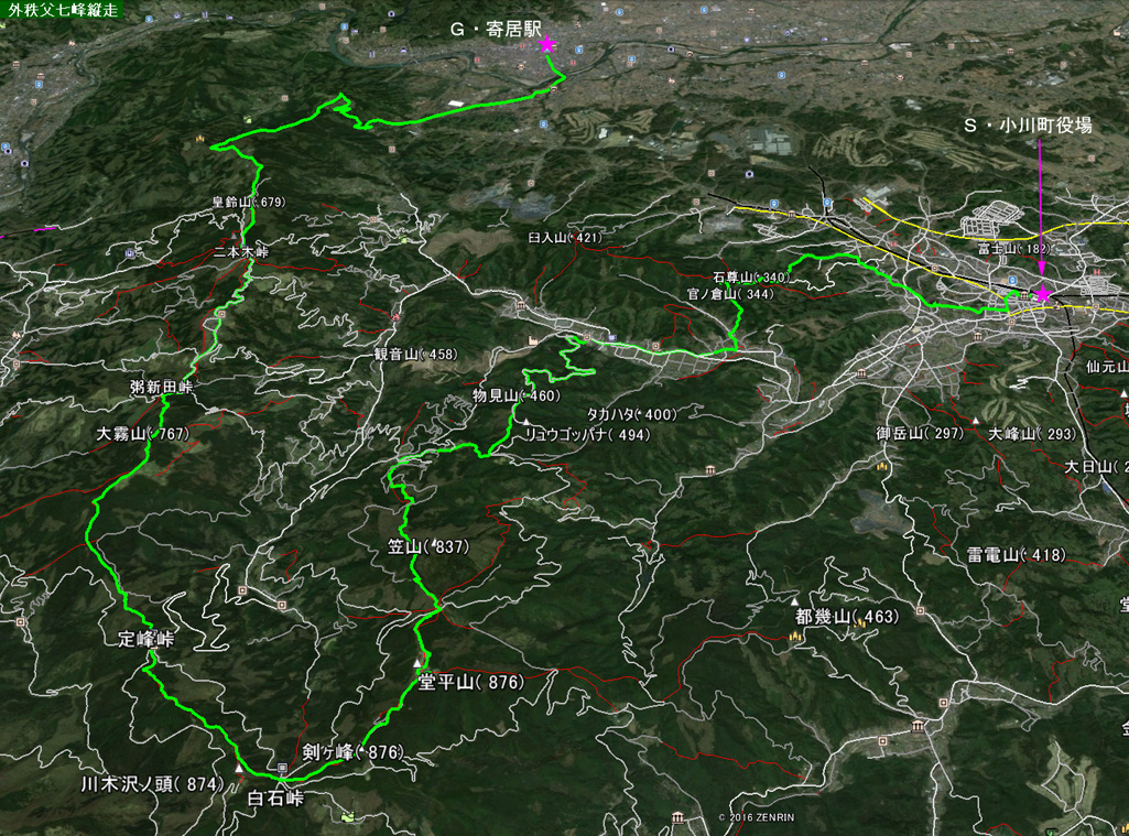 小川町役場標高/90m 寄居駅標高/98m 標高差/786m 累積標高/2250m 総歩行距離/43244m |