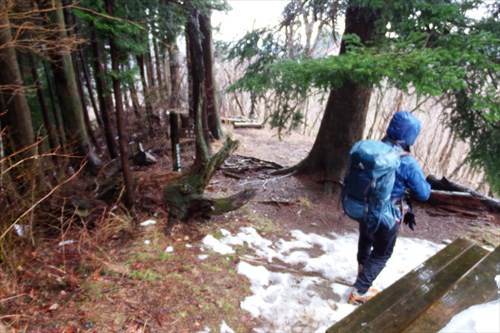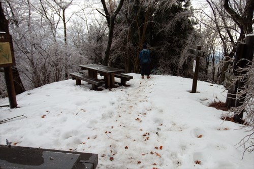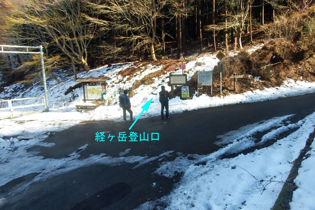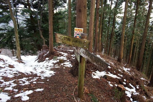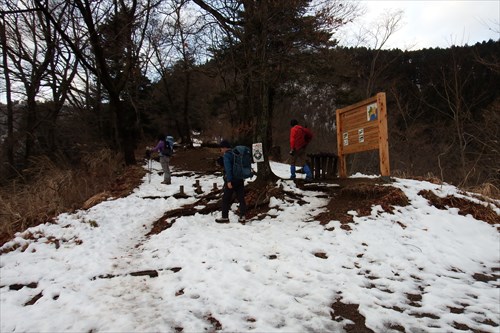 気温があがるとともに雨氷が溶け始めてボタボタロードに | 半原越マデ1.0`指導標(ベンチ) 枝尾根地点なので要注意 |