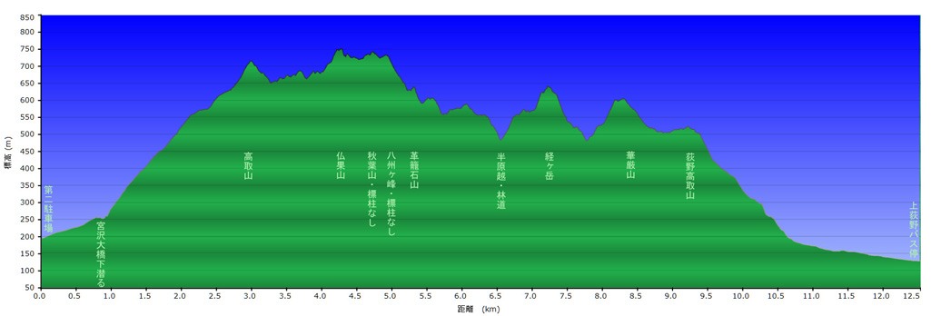 ふれあいの村第二P標高/204M 上荻野バス停/129M 標高差/618M 上り累計標高/1158.3M 総歩行距離/12515M | ||||