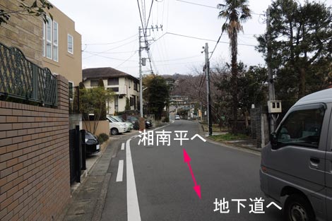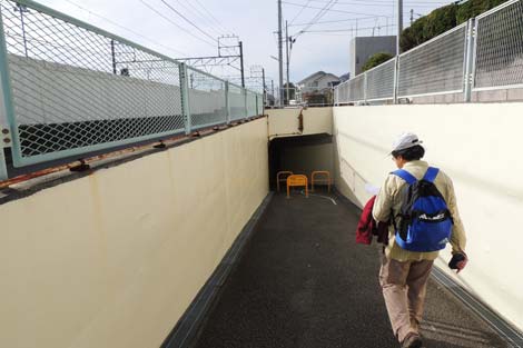 地下道入口拡大図 情報不足で地下道(当初は踏切と思い込んでいたため)がわからず、今回は跨線橋経由で湘南平へ向かう |