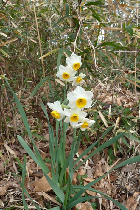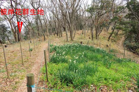 彼岸花群生地横で咲く水仙 | 都会のお山らしい洒落たベンチ | |||