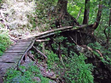 自然歩道・田立の滝(県立自然公園・日本の滝百選) 大滝川の渓谷にかかる無数の瀑布を総称して田立の滝と呼びます。それらは神秘的で実に感動的。 粒栗駐車場から主瀑の天河滝まで森林の中の遊歩道を約一時間半。 (南木曽町ガイドマップ抜粋) 田立の滝ルート解説 田立の滝オートキャンプ場を横切って舗装された林道を進むと粒栗第一・第二駐車場に着く。 登山口横にはトイレと水場がある。 不動岩展望地までは10分間隔で「石の上にも300年・さわら大師」「もみたろう」「けやきちくん」 「さわら大師」「ひのきイチロウ」などユニークな名前の樹木に会える。 不動岩展望地にはベンチがあるのでひと休みしよう。展望地から今にも崩れ落ちそうな木道を渡って、 螺旋滝分岐点や洗心滝を過ぎると主瀑の「霧ヶ滝」「天河滝」が近い。 どの滝も滝壺付近まで近づけたり、滝の上部から覗きこむこともできるので涼味満点。 紅葉の時期の美しさも想像できるがこれからの時期、お手軽登山としてはお薦めだ。 尚、霧ヶ滝から丸淵までは滝しぶきを浴びて滑りやすい木製階段や岩ゴロ道歩きになるので 慎重に足を運びたい。 mikio コメント 下山時に螺旋滝付近ですれちがった女性の二人連れは、ストック代わりに用意されている 棒一本だけを手にして、スカートにヒールのミュールとサンダルという出で立ち。 はたしてどこまで登っていけることか・・・ いや、ここまで登ってきたのが凄いと言えるのか・・・ 無事下山できることを祈りつつ、唖然としてその後ろ姿を眼で追ってしまいました。 キャンプ地&立ち寄り温泉 岐阜県・福岡町/福岡ローマン渓谷オートキャンプ場 不知峡倉屋温泉・おんぽいの湯 |