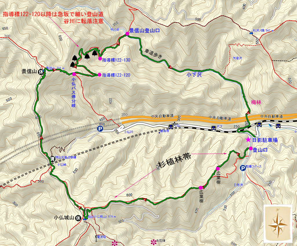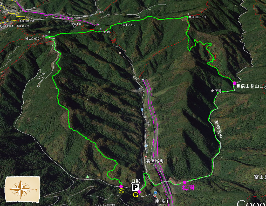 日影駐車場標高/242M 標高差/485.1M 累積標高/711.6M 総歩行距離/9774M |
