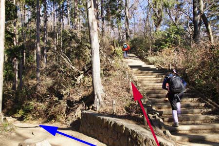 至れり尽くせりの登山道 | 青=モミジ台への巻き道 赤=数分で高尾山山頂へ | |||