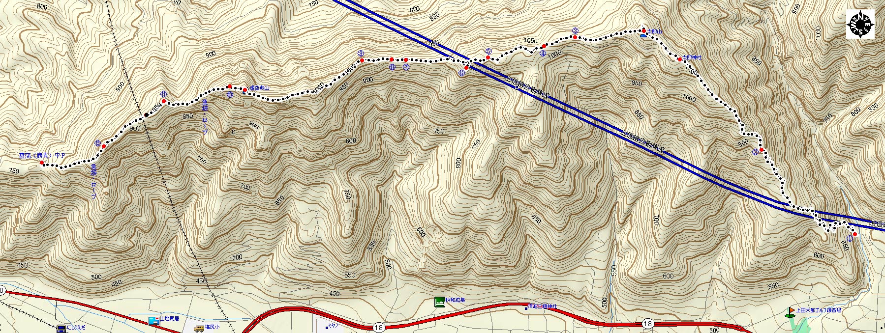 この地図は国土交通省・国土地理院長の承認を得て、同院発行の 1:25000地形図に基づき作成された承認番号(平19総使、第186-21250号)を転載したものです。 《使用データソフト GARMIN MapSource》 |
