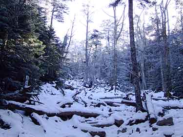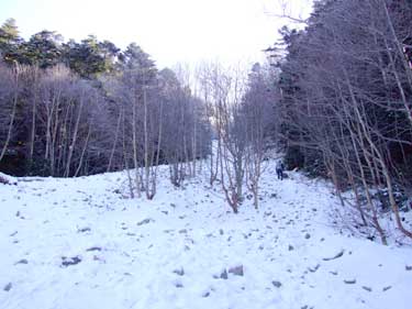高度が上がる毎に積雪量が増え、踏み跡はツルテカ状態・・・ 新雪部分を選んでグリップを確保 |