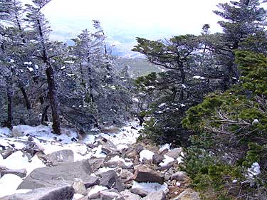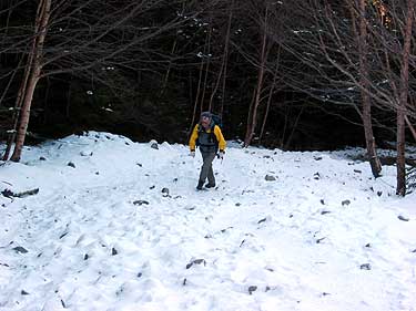 残雪は消えたが相変わらずガレ道の急下降が続く |