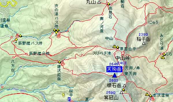 ![]() クリックすると「天狗岳・渋御殿湯」近辺の 広域地図を見ることが出来ます。マップコード 218 714 829 |