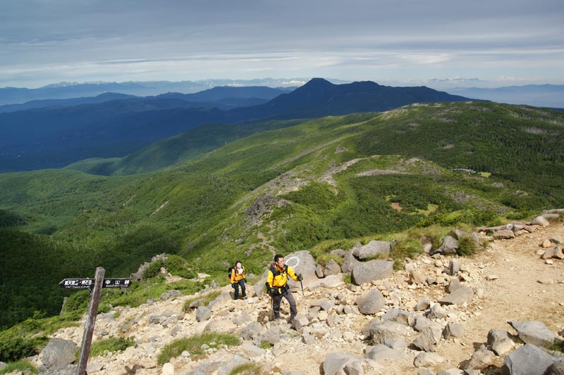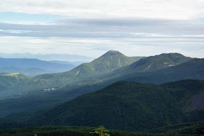 中山峠分岐点の眼下に天狗の奥庭・スリバチ池・黒百合ヒュッテ 蓼科山の右に妙高山・火打山を望む |