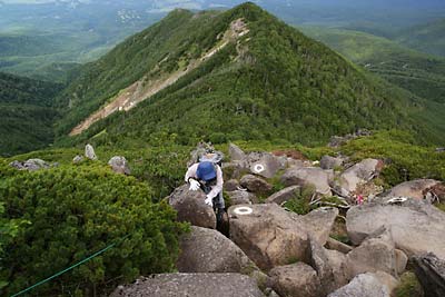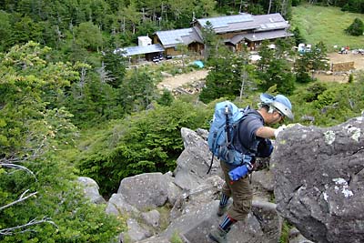 東天狗を目指してガレ場を下る |