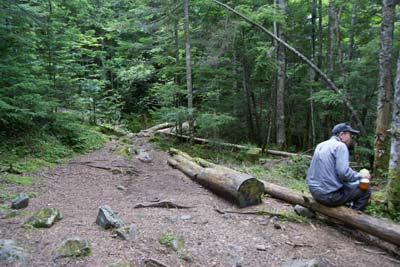 この丸太ベンチ地点で岩ゴロ道が終わる