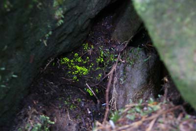 登山道脇ではヒカリゴケが見られる |