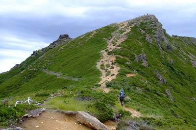 ご覧の様な岩ゴロ道の連続で登りより下りの方が神経を使う登山道 |