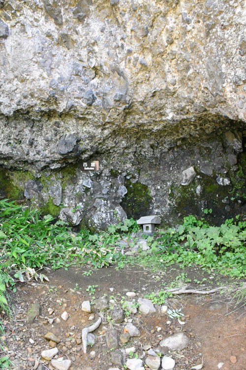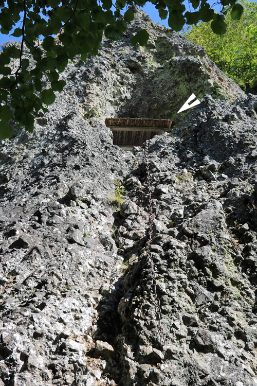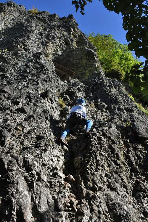 戸隠三十三窟のひとつ西窟(さいくつ)に登る 取っつきのクサリが短いため、最初の2メートルほどは腕力勝負 |