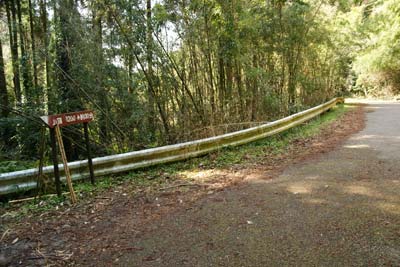 伏姫籠窟側ルートはかなりの急坂だ | 林道終点に到着・伏姫籠窟側登山口 「山頂まで1.2km 約30分の指導標」 |