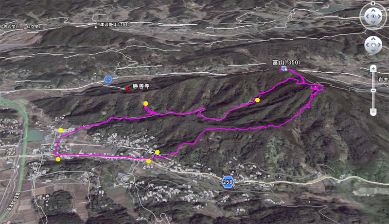 (計曲線 50M 主曲線 10M) 駐車場標高/15M 標高差/334.5M 総歩行距離/7293M |