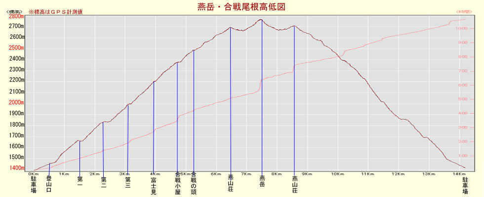 駐車場標高/1390M 標高差/1372.9M 総歩行距離/14198M |