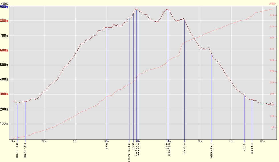 筑波山高低図 第3駐車場標高/247M 標高差/630M 総歩行距離/8323M |