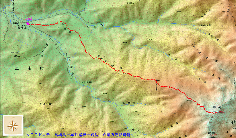 (計曲線 50M 主曲線 10M) 馬場島駐車場標高/760M 早月尾根登山口標高/770M 標高差/2239M 総歩行距離/16747M |
