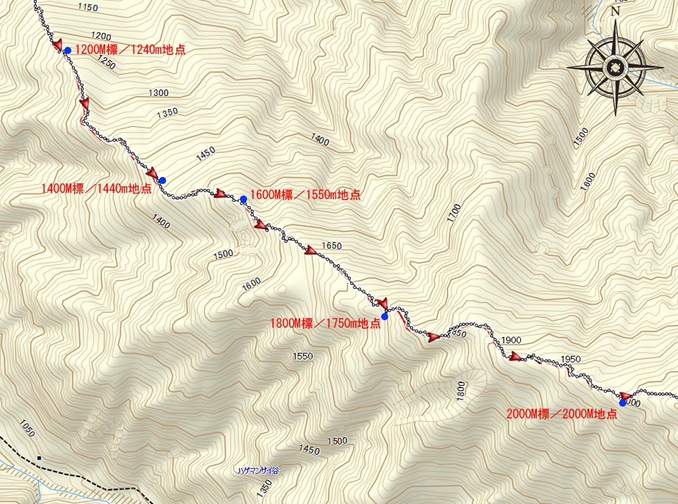 山頂まで標高200b毎に設置されており、高度の正確さにはバラツキ(下段参照)もみられるが歩く目安となりありがたい | ||||