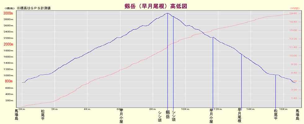 馬場島駐車場標高/760M 早月尾根登山口標高/770M 標高差/2239M 総歩行距離/16747M | ||||