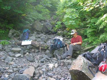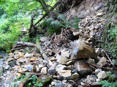 まめうち平の緩い登りで距離を稼ぎ、残り2.5kの看板を過ぎると蝶沢の源流部ガレ場に出る。
