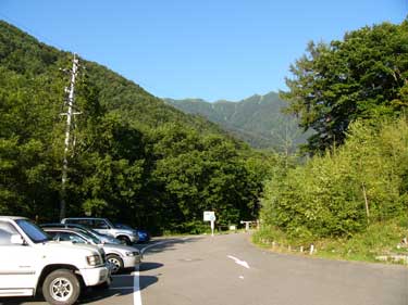 三股駐車場からはこれから登る蝶槍と蝶ヶ岳ヒュッテが見える。
