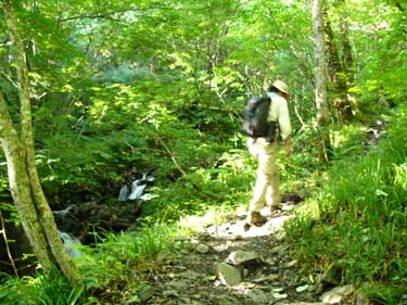 本沢に架かる吊り橋を渡って沢沿いに登ると間もなく「力水」と呼ばれる水場に出る。