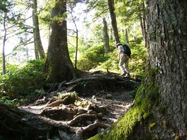 静寂なカラマツ林を抜けて右下に蝶沢の沢音を聞くと、「まめうち平」と呼ばれる平地まで