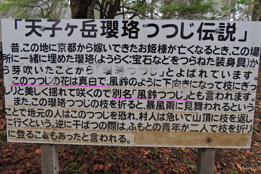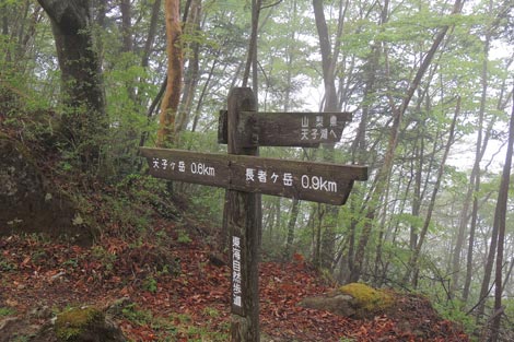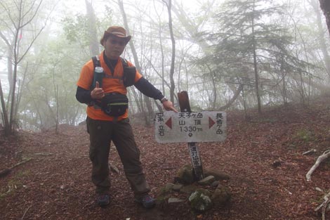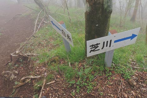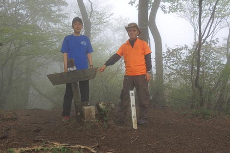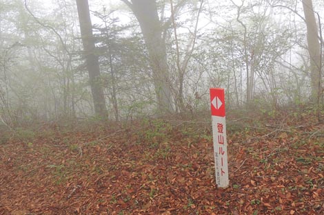 こりゃ〜、シロヤシオどころか道に迷いそうだ! | 広い山頂だけに濃霧時はこの指導標だけが頼り | ||||