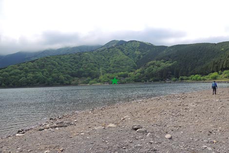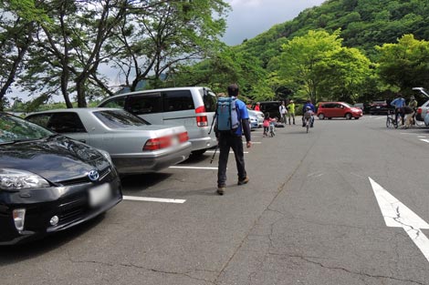 渇水気味の田貫湖畔を歩いて駐車場(★)を目指す | 田貫湖キャンプ場P着(トイレ有り) | ||||