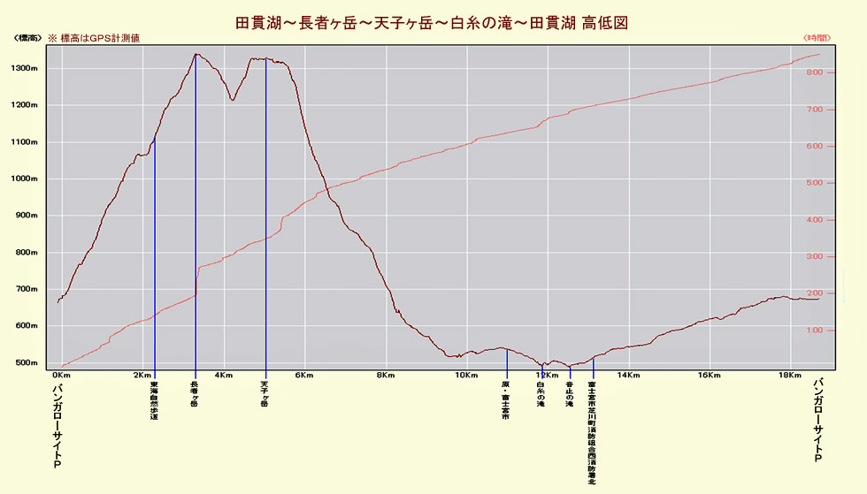 (計曲線 50M 主曲線 10M) 長者ヶ岳/1335.8M 天子ヶ岳/1330M キャンプ場P標高/660M 白糸ノ滝標高/488M 標高差/848M 総歩行距離/18702M |