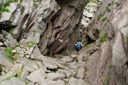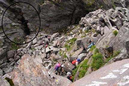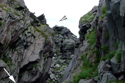 岩の隙間を縫って下ると | 頭上には山頂に立つ登山者が見える | |||