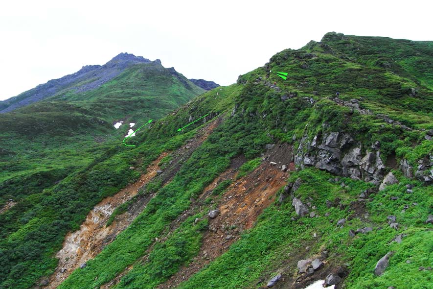 御苗代より鳥海山(新山) を望む 矢印=七五三掛(しめかけ)分岐点 左・千蛇谷雪渓を経て御室へ 右・外輪山を経て御室へ |