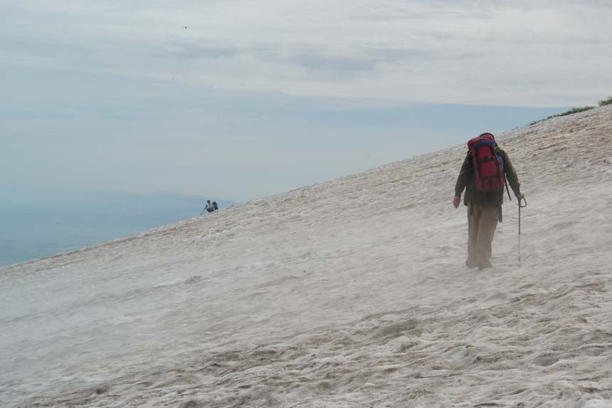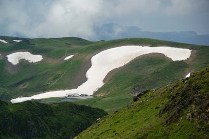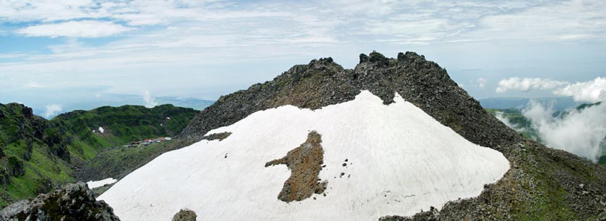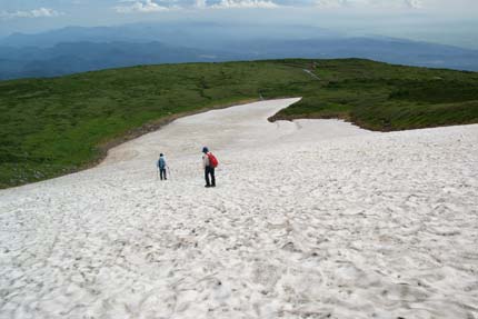 伏拝岳より下山ルートの、小・大雪路 心字雪渓 河原宿小屋方面を望む (日本海と酒田市) |