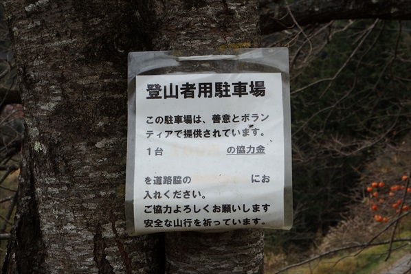 林道歩きで登山口へ向かう | 前方通行止め看板地点が登山口 | |||