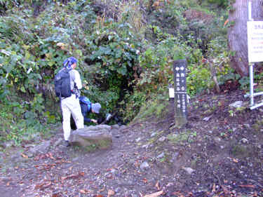 水場横に立つ登山口標柱(左・海谷渓谷1時間 右・駒ヶ岳2時間30分)に従って