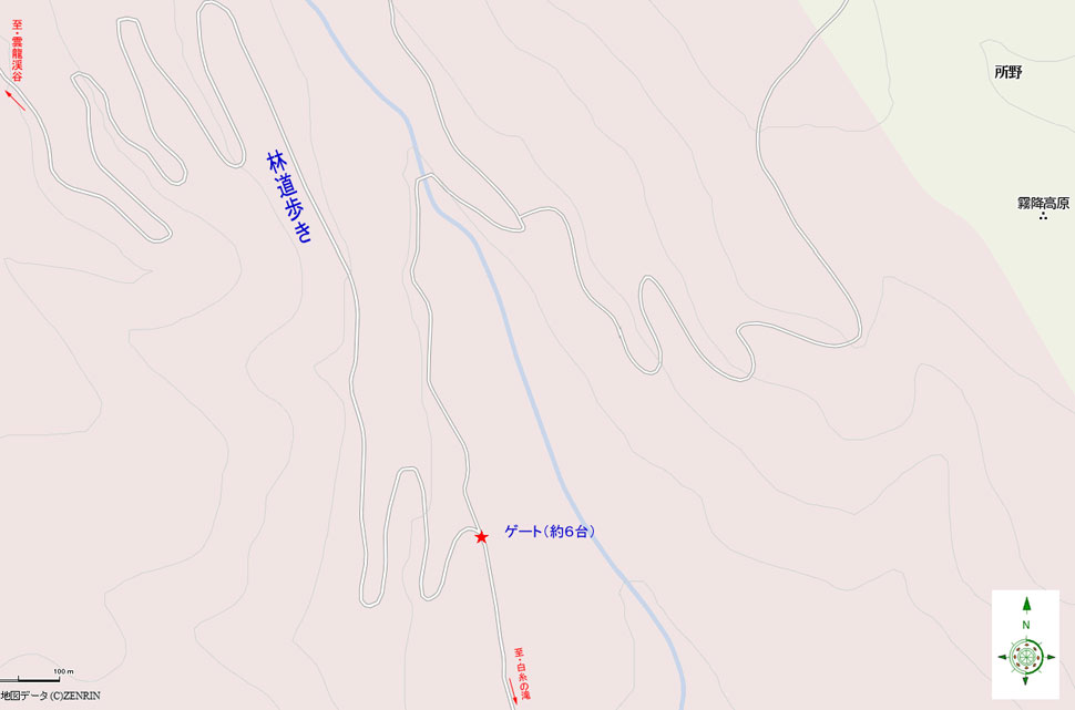 白糸の滝から最終ゲート(数台駐車可)、以後は洞門岩まで林道歩きとなる |